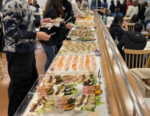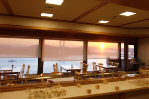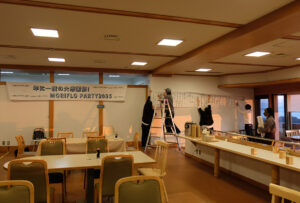 ゴミを片付けた後は、忘年会会場に移動。今年はリニューアルした鷲羽山レストハウスで行いました。こちらは明るいとオーシャンビューが望め、夕方になると夕陽が綺麗に見えるところです。忘年会も毎年、忘年会実行委員となった社員が色々準備運営を行なっています。